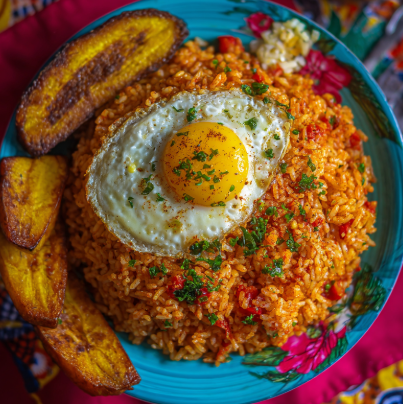 El arroz jollof (arroz con tomate y especias) suele servirse con plátano frito y huevo cocido, su compleja nota ahumada y picante de scotch bonnet recuerda al jambalaya cajún, pero con un fondo más terroso.