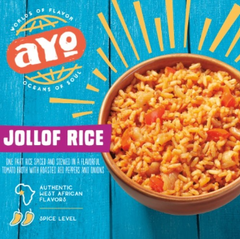 Marcas como Ayo Foods ahora ofrecen arroz jollof auténtico (como se muestra) en el pasillo de congelados.