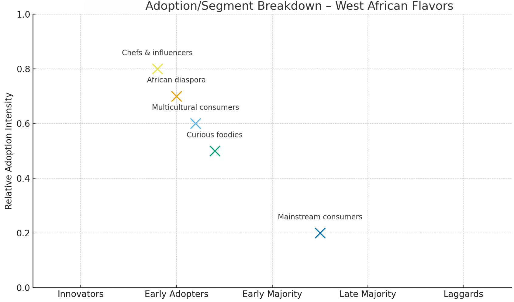 Los primeros adoptantes incluyen comunidades de la diáspora africana (millones de inmigrantes y descendientes en EE. UU. y Canadá), junto con millennials y Gen Z exploradores de sabor.